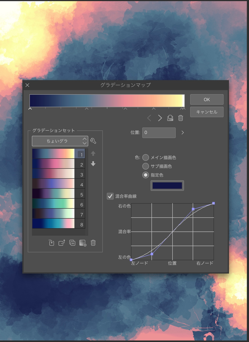 テクスチャに、「アルコールマーカーテクスチャ」と「レトロノイズ」(どっちも同じ作者さんの素材。使いやすくて素敵!)をオーバーレイで乗せて、グラデーションマップを薄く置いて完成〜〜!!!!